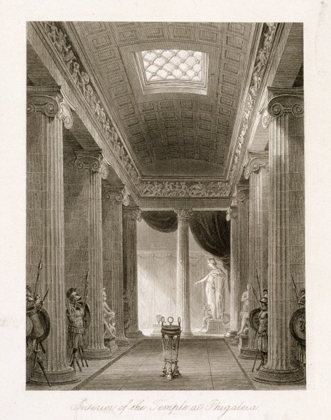The architecture of the temple is one of the most strikingly unusual examples of the period, departing significantly from the norms of Doric and Ionic practice and including what is perhaps the first use of the Corinthian order and the first temple to have a continuous frieze around the interior of the naos. From the style of the frieze it belongs to the High Classical period, probably carved around 400 BC.